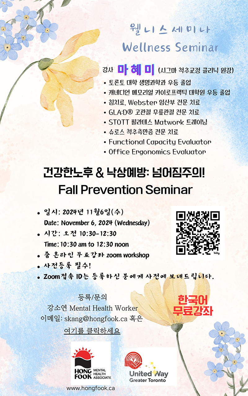 홍푹 정신건강협회는 11월 웰니스 세미나(Wellness Seminar) 무료 온라인 한국어 프로그램으로 11월6일(수) ‘건강한 노후 &낙상예방: 넘머짐 주의!’(Fall Prevention Seminar)를 주제로 하는 세미나에 이어 12일(화)에는 ‘희망은 언제나 있습니다. 함께 나누어요- 자살예방 세미나’를 개최한다.