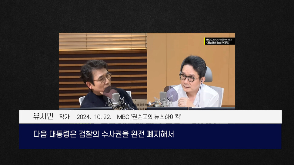 유시민 작가: 이 국회 임기가 끝나기 전에 대통령 선거가 또 있잖아요. 민주당이 집권하게 되면 99% 그렇게 간다고 봐야죠. 검사가 없어지지는 않지만 우리가 알던, 수사권을 가지고 정치에 개입할 수 있는 이런 정치검찰의 운명은 지금 시한부다. 저는 그렇게 보고요. 이게 하나회를 숙청해서 군부 쿠데타의 가능성을 없앴던 김영삼 대통령처럼 다음 대통령은 검찰의 수사권을 완전 폐지해서 기소청으로 만듦으로써 정치검찰의 정치 개입 가능성을 완전히 제도적으로 근절하는 일을 해야 될 거라고 봐요.
