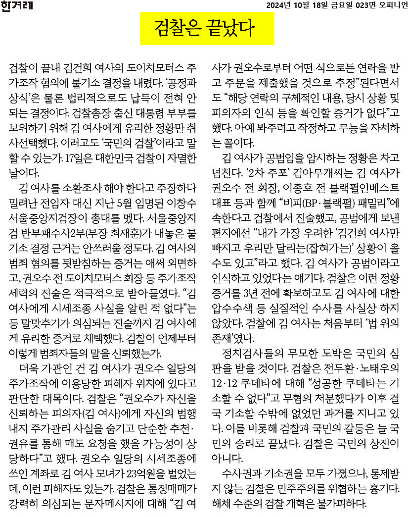 김건희 여사의 명품백 수수와 도이치모터스 주가조작에 대한 검찰의 무혐의 처분은 ‘검찰은 끝났다‘(10월18일치 한겨레 사설)는 진단을 받기에 충분합니다.