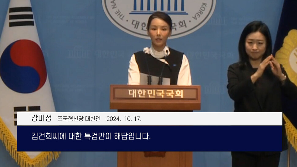 강미정 조국혁신당 대변인: 검찰의 흑역사는 다시는 반복되지 못할지도 모릅니다. 국민의 신뢰를 잃은 검찰의 권력바라기식 김건희씨 무혐의 처분은 검찰이 권력의 똥개임을 스스로 증명하면서 존재 이유를 부정한 것이기 때문입니다…검찰의 해체와 근본적 재건축, 김건희씨에 대한 특검만이 해답입니다…검찰을 중대범죄수사청과 공소청으로 분리해내겠습니다. 그래서 최고권력자의 눈치를 보면서 수사 결과로 장난치지 못하게 만들겠습니다.