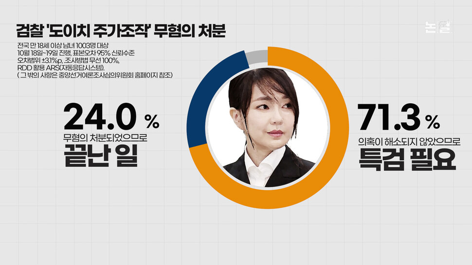 ‘여론조사꽃’의 10월18~19일 여론조사를 보면, 검찰의 이번 무혐의 처분에 대해 응답자의 71.3%가 ‘의혹이 해소되지 않았으므로 특검이 필요하다’고 응답했습니다. ‘무혐의 처분되었으므로 끝난 일이다’라는 응답은 24.0%에 그쳤습니다(전국 만 18세 이상 남녀 1005명 전화면접, 표본오차 ±3.1%p(95% 신뢰수준), 그 밖의 사항은 중앙선거여론조사심의위원회 홈페이지 참조).