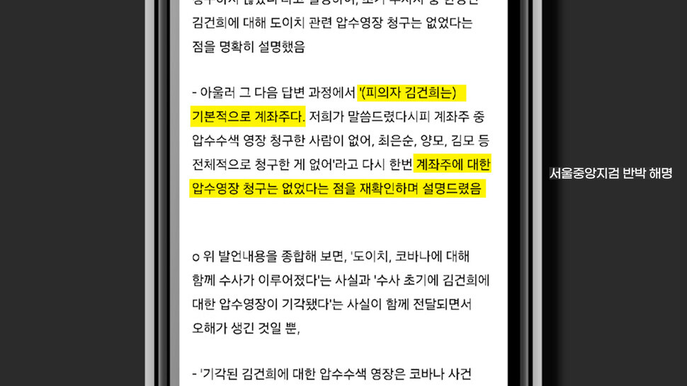 최재훈 서울중앙지검 반부패수사2부장: 2020년부터 김 여사와 관련해서 코바나컨텐츠와 도이치모터스를 함께 수사하면서 압수수색 영장도 함께 청구하기도 했다. 김 여사에 대해서는 주거지, 사무실, 휴대전화까지 압수수색 영장을 청구했는데, 모두 기각을 당했다. 이후 영장을 다시 청구하지는 않았다.