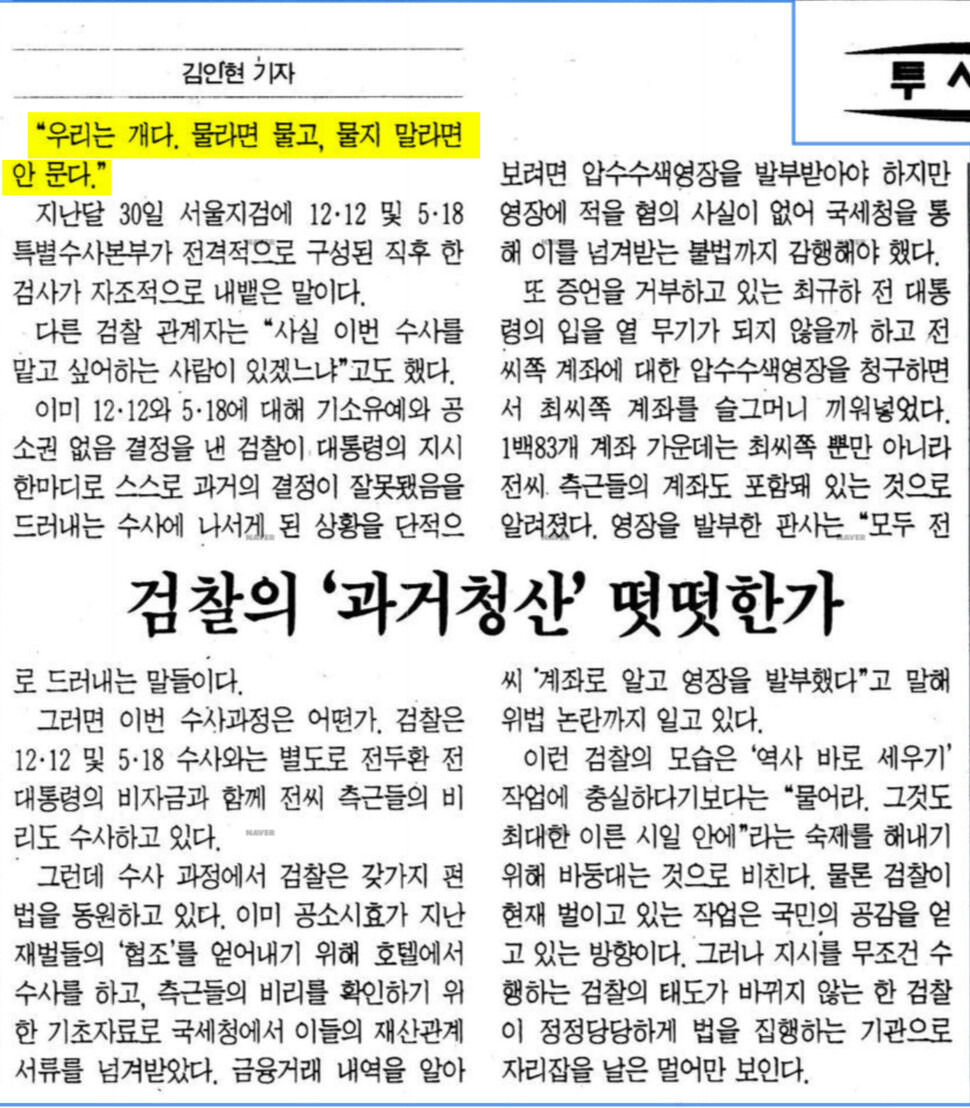 30년 전인 1995년 12월18일치 한겨레에 실린 기자 칼럼의 첫 문장입니다. 전두환의 12·12 쿠데타 및 5·18 민주화운동 유혈진압에 대해 검찰이 “성공한 쿠데타는 기소할 수 없다”며 무혐의 처분했다가 김영삼 당시 대통령의 재수사 지시가 떨어지자 화들짝 놀라 특별수사본부를 구성한 직후였습니다. 권력의 뜻에 따라 오락가락하는 검찰의 행태를 한탄하던 한 검사가 내뱉은 말이라고 합니다. 당시 큰 화제를 모았던 이 칼럼은 검찰을 ‘개’로 공식(?) 지칭하는 시초가 됐습니다.