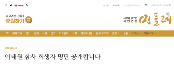 이후 극소수의 언론이 159명 희생자 중 몇 사람의 이름과 얼굴을 공개하긴 했지만, 대부분의 주류 언론들은 지금도 희생자 이름을 부르지 않고 있다. 여전히 명단 공개를 ‘2차 가해’라고 생각하는지, 명단을 공개한 <시민언론민들레>를 ‘패륜 언론’이라고 생각하는지 묻고 싶다. 나중에 유족들은 희생자 이름을 불러준 <시민언론민들레>에 고마움을 표시했다. 명단 공개를 ‘2차 가해’라고 주장했던 언론과 기자들은 그 이유를 이해하지 못할 수도 있다. 사회적 참사 희생자를 ‘사고 사망자’라고 부르면서 개인에게 책임을 떠넘기려는 이 정부의 가스라이팅(gaslighting)이 성공한 것이다.
