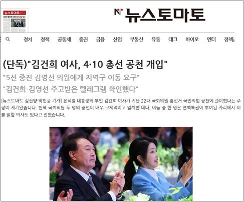 ▲김건희 여사 공천개입 의혹을 처음 보도한 뉴스토마토 9월 5일 보도 ⓒ 뉴스토마토