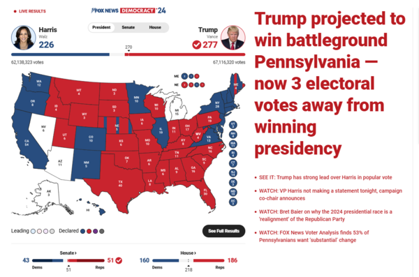 민주당 해리스 후보의 패배 가능성이 더 높다고 본 사람들도 이렇게까지 참패할 것을 예상한 경우는 많지 않아 보인다. 트럼프는 선거인단도 훌쩍 앞서는 결과를 보이고 있지만 총득표수에서도 해리스를 꽤 뛰어넘었다. 이제 행정부, 상·하원, 대법원 등을 모두 틀어쥐게 된 트럼프 2기 정부가 다가오고 있다.
