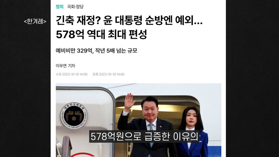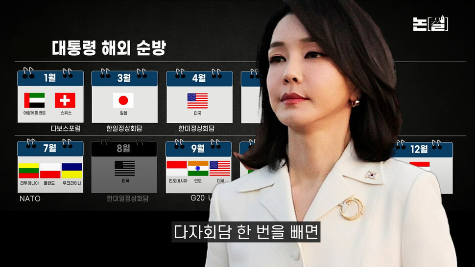 사실 국빈 순방이 아닌 경우 외국 정상들도 배우자를 동반하지 않고 혼자 실무적으로 순방에 나서는 경우가 많습니다. 김 여사는 그런 경우조차 한번을 빼고 모두 순방에 동행했습니다. 문재인 정부에서 평균 200억원 정도가 든 대통령 순방 예산이 올해 윤석열 정부에서는 578억원으로 급증한 이유의 하나일 겁니다.