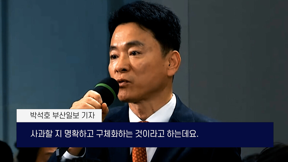 ‘왠 일로 사과를 다 하네’ 하신 분들이 많았을 겁니다. 하지만 딱 거기까지였죠. 도대체 뭘 어떻게 잘못했는지, 재발을 막을 대책은 뭔지는 전혀 설명하지 않았습니다. 사과의 기본 요건을 갖추지 않은 무늬만 사과에 그쳤습니다. 회견 현장의 기자(부산일보)도 이 점을 캐물었죠.