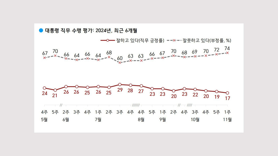 여권에서도 이번 기자회견이 민심을 돌릴 마지막 기회라는 지적이 쏟아진 바 있습니다. 그러나 윤 대통령은 스스로 그 기회를 걷어차고 말았습니다. 그 후과는 민심의 폭발로 이어질 가능성이 큽니다. 8일 한국갤럽 여론조사 결과 윤 대통령 지지율은 17%로 또 다시 취임 이후 최저치를 갈아치웠습니다.(자세한 내용 중앙선거여론조사심의위 홈페이지 참조) 바닥이 안 보입니다. 윤 대통령의 운명도 갈수록 바람 앞의 등불 신세가 되고 있습니다. 윤 대통령은 조기 퇴진은 없다는 점을 분명히 했습니다.