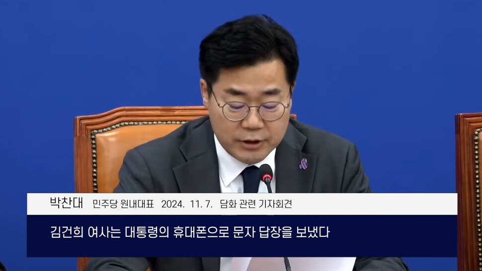 “자신은 김건희 여사의 휴대폰 못 보는데, 여사는 자기 폰으로 문자 보냈다. 역사상 최악이었다.”(박찬대 민주당 원내대표, 7일 담화 관련 기자회견)
