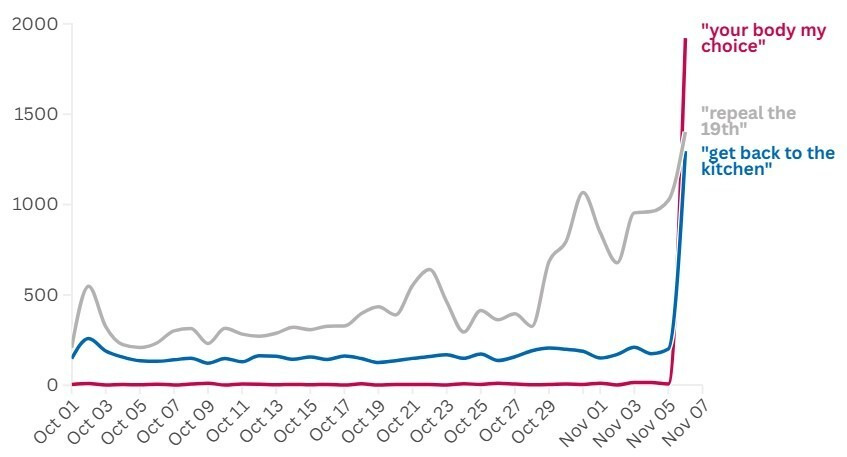 미 싱크탱크 전략대화연구소(ISD)는 8일, 미 대선(5일) 직후 24시간 동안 엑스(X·옛 트위터), 틱톡 등 온라인 플랫폼에서 여성 혐오 표현이 폭발적으로 늘었다고 밝혔다. 여성의 자기 결정권을 지지하는 ‘나의 몸, 나의 선택’(My body, my choice)을 조롱하는 ‘너의 몸, 나의 선택’(your body, my choice), ‘주방으로 돌아가’(get back to the kitchen) 등의 언급이 약 4600% 늘었다는 것이다. ISD는 미국 백인 민족주의 팟캐스트를 운영하는 인플루언서 닉 푸엔테스가 초기 선동가 중 한명으로 보인다고 분석했다. 예를 들면 그가 쓴 ‘당신의 몸, 나의 선택. 영원히’라는 엑스 게시물은 3500만회 이상 조회됐다.