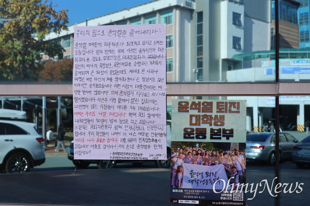 또 다른 대자보에는 "날이 갈수록 민심은 윤석열을 떠나고 있고 탄핵은 거스를 수 없는 대세가 됐다"면서 "탄핵 열차는 이미 출발했다. 국회는 윤석열 탄핵소추안을 즉각 발의하라"고 촉구했다.