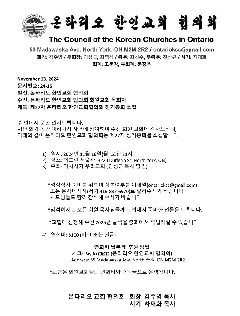 교회협의회는 이번 총회에 회원교회 담임목사와 평신도 대표들의 참석을 당부하고 점심 준비를 위해 미리 참가여부를 전화나 이메일(416-887-6970, ontariokcc@gmail.com)로 알려줄 것을 요망했다. 아울러 연회비($100)를 납부해야 총회 발언권이 주어지고 교협도 운영할 수 있다며 회비납부와 더불어 후원에도 동참해줄 것을 부탁했다.