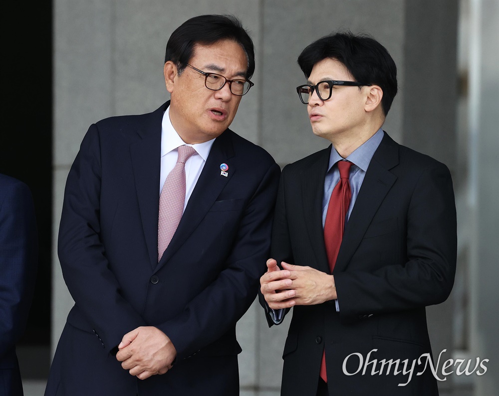 한 대표는 장 전 최고위원의 공격에 대해 주 위원장이 언급한 내용을 반복하는 것으로 사실상 입장 표명을 대신했다. 한 대표는 이날 국회에서 열린 의원총회 직후 기자들과 만나 당원 게시판 사태에 대한 질문을 받고 "법률자문위에서 허위 사실에 대해 법적 대응한다고 밝힌 바 있다"며 "여러 가지 중요한 사안이 많지 않나. 그런 상황에서 분열을 조장할 필요는 없다고 생각한다"고 말했다. < 오마이 조선혜 기자 >