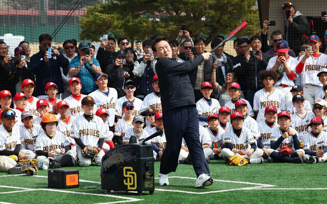 윤석열 대통령이 지난 3월16일 서울 용산어린이정원 야구장에서 열린 샌디에이고 파드리스의 어린이 야구교실에서 유소년 야구선수들이 지켜보는 가운데 직접 타격해 보고 있다. 연합