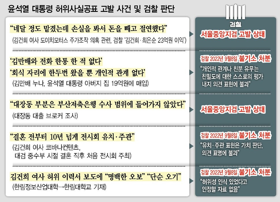 검찰은 윤 대통령의 대선 후보 시절 허위사실공표 혐의에 대해서는 ‘입은 푼다’는 기준을 충실히 적용해 왔다. 윤 대통령은 오랜 법조기자 생활을 한 김만배씨와의 친분을 부정했지만, 김씨 누나가 부친 집을 19억원에 매입한 사실 등이 드러난 바 있다. 검찰은 2022년 9월 “개인적 관계나 친분 유무는 스스로 평가 내지 의견표현에 불과하다”며 불기소 처분했다. 고 김문기씨를 ‘모른다’고 했던 이재명 대표를 기소할 때와는 정반대 태도였다. 윤 대통령이 후보 시절 김건희 여사의 허위 이력 보도를 “명백한 오보”라고 주장한 것에 대해서도 “허위라는 인식이 있었다고 인정할 자료가 없다”며 불기소 처분했다.