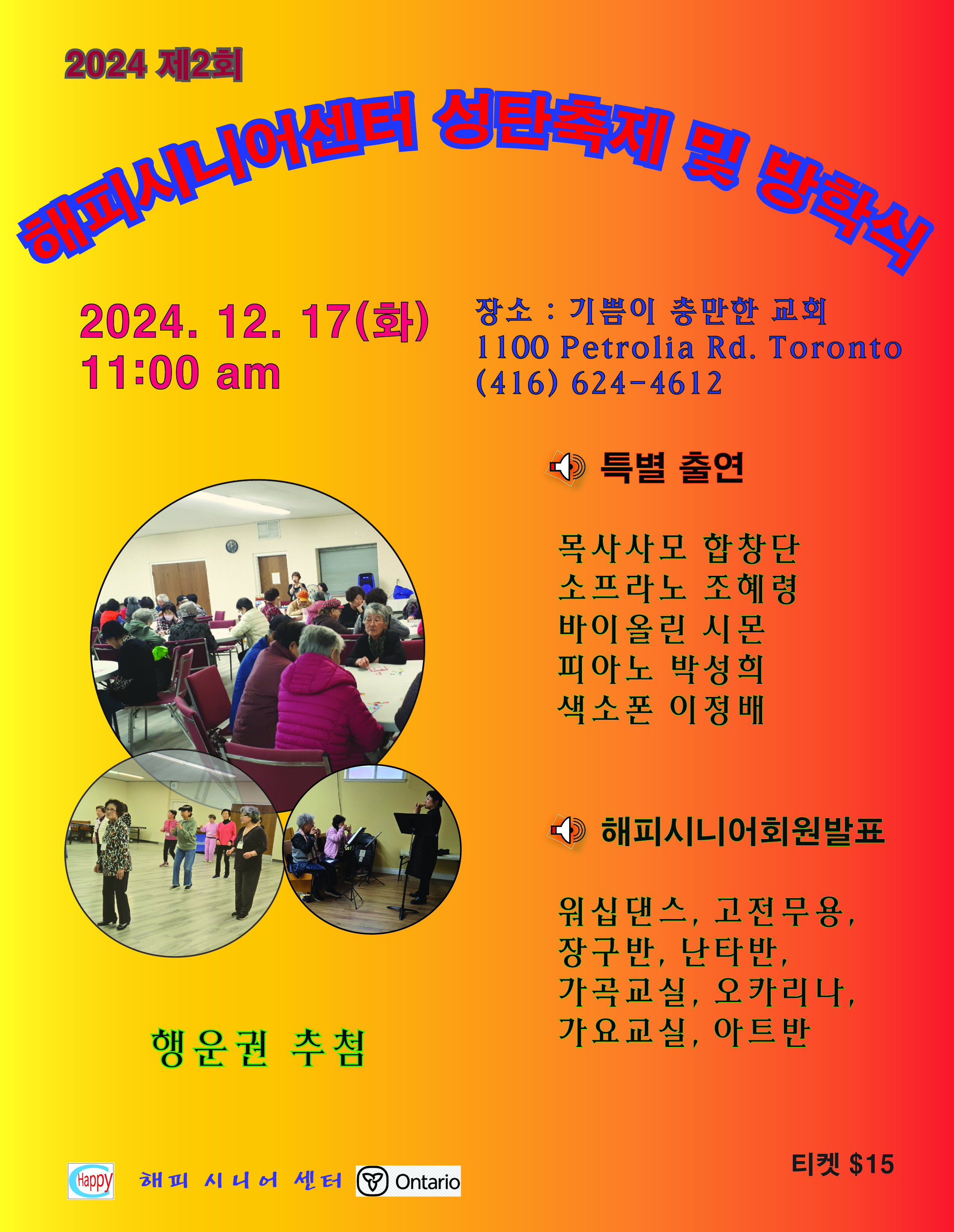 노년의 신체와 정신건강을 돕고 행복한 노후생활을 뒷받침하는데 주안을 준 봉사단체 ‘해피 시니어센터’(회장 최춘해)가 12월17일(화) 오전 11시부터 ‘제2회 성탄축제 및 방학식’을 기쁨이 충만한교회(1100 Petrolia Rd. M3J 2X4: 담임 양요셉 목사)에서 개최한다.