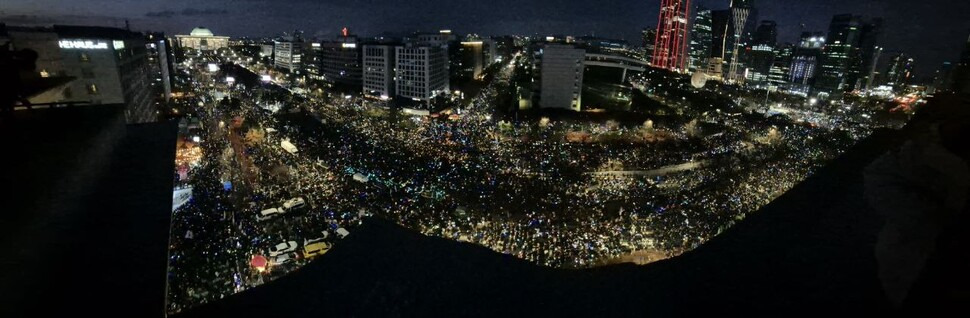 이날 국회 앞에는 주변인 국회의사당역과 여의도역을 일부 열차가 무정차 통과할 정도로 압도적인 인파가 몰렸지만, 큰 충돌은 빚어지지 않았다. “탄핵” 탄핵”을 외치는 시민의 목소리만은 밤 늦은 시간까지 국회를 향해 울렸다. < 한겨레 김가윤 박고은 기자 >