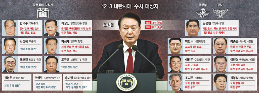 검찰과 경찰이 6일 동시에 ‘윤석열 내란’ 사건 수사에 나섬에 따라 수사 범위와 대상에 관심이 모아진다. 핵심 피의자인 윤석열 대통령과 김용현 전 국방부 장관은 물론, 한덕수 국무총리 등 계엄 전 국무회의에 참석한 국무위원, 박안수 전 계엄사령관 등 군 관계자, 국회 봉쇄를 지시한 조지호 경찰청장 등이 1차 수사 대상으로 꼽힌다.