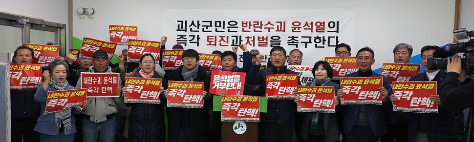 괴산지역 주민 등이 꾸린 ‘윤석열 퇴진 괴산 군민 행동’은 9일 괴산군청에서 기자회견을 열어 윤 대통령 탄핵을 촉구했다. 이들은 “괴산은 일제에 목숨으로 항거한 홍범식의 땅이다. 우리는 역사에 부끄럽지 않게 반역의 수괴 윤석열과 그 일당을 자리에서 끌어내리고 민주주의를 지키겠다. 윤석열과 반란 책임자를 색출해서 처벌해야 한다”고 밝혔다.