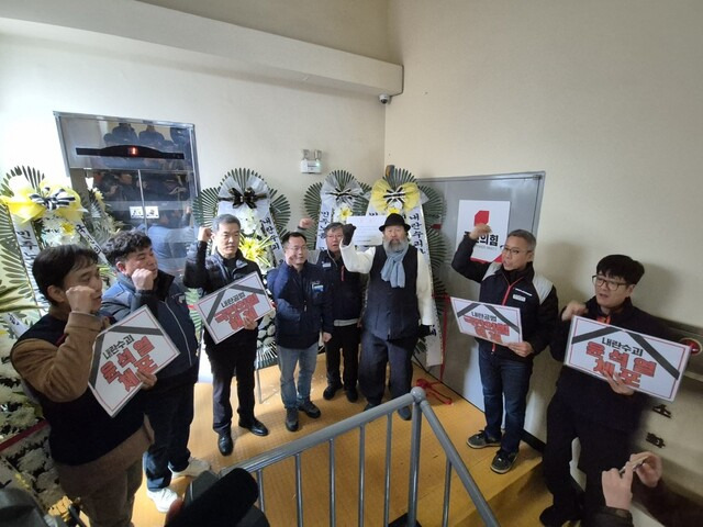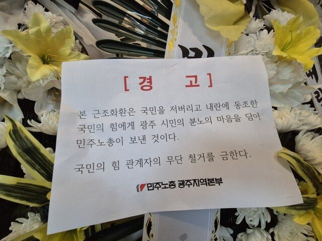 민주노총광주본부는 9일 오후 3시15분 광주시 서구 국민의힘 광주광역시당사무실 문 앞에 근조 화환 5개를 놓았다. 이종욱 광주본부장 등 민주노총 광주본부 관계자들이 직접 들고 올라간 근조화환엔 ‘내란수괴 윤석열 체포’, ‘제2내란 국민의 힘’ 등의 구호가 적힌 리본이 달렸다. 또 ‘‘국민을 저버리고 내란에 동조한 국민의힘에 광주시민 분노의 마음을 담아 보낸 것이다. 무단 철거를 금한다’라는 경고문을 붙였다. 국민의힘 광주시당 문은 굳게 닫혀 있었다.