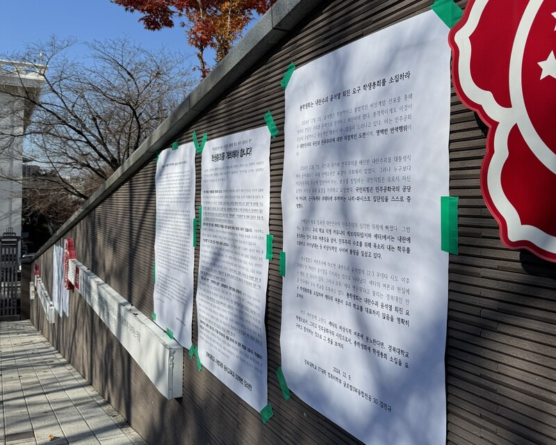 이들은 기자회견 뒤, 경북대 북문에서 사회과학대 앞 여정남 열사 공원까지 행진하는 학내 시위를 벌였다. 학내 곳곳에는 정권 퇴진을 요구하는 집회에 학생들도 함께 나서자는 대자보가 나붙었다. 경북대 컴퓨터학부 20학번 김민규씨는 대자보에서 “누구보다 자유민주주의 수호에 앞장서야 할 국민의힘은 보수를 참칭하며 오로지 자신의 이익을 위해 탄핵안 표결을 거부하고 도망쳤다. 스스로 민주공화국의 공당이 아니며 군사독재와 쿠데타에 부역하는 집단임을 스스로 증명했다. 총학생회는 내란수괴 윤석열 퇴진을 요구하는 학생총회를 소집하라”고 요구했다.