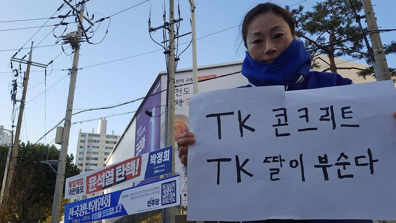 박정희 더불어민주당 대구 북구갑 지역위원장은 이날 자신의 페이스북에 “티케이(TK) 콘크리트, 티케이(TK) 딸이 부순다”고 쓴 손팻말을 들고 찍은 여성들의 사진 여러 장을 올렸다. 이어 “시간은 우리의 편이다. 그래, 우리 티케이(TK) 딸들의 힘으로 벽을 넘어설 것이다. 세대를 넘나드는 딸들의 염원이 여기(대구·경북)를 바꾸어 놓을 것”이라고 썼다.