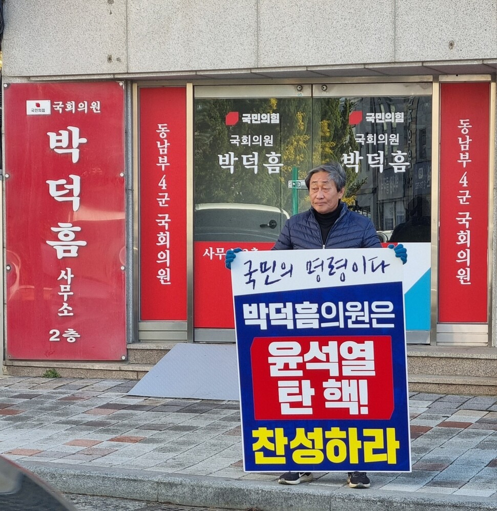 이날 박 의원 사무소 앞에선 탄핵 표결 참여를 촉구하는 1인 시위가 벌어지기도 했다.