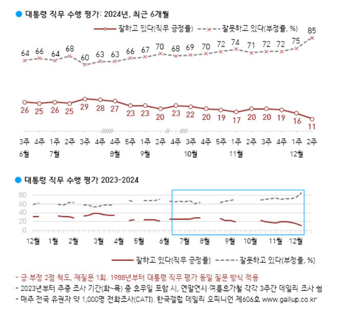 한국갤럽은 지난 10~12일 전국 만 18살 이상 1002명을 대상으로 전화조사원 인터뷰 한 결과(표본오차는 95% 신뢰 수준에 ±3.1%포인트, 응답률 15.8%), 윤 대통령 직무 수행 긍정 평가는 11%로 조사됐다고 밝혔다. 이는 지난주 조사(16%)보다 5%포인트 하락한 수치로, 윤 대통령 취임 이후 최저치다. 부정 평가는 85%로 지난주보다 10%포인트 상승하며 역시 취임 이후 최고치를 기록했다. 부정평가 사유로는 ‘비상계엄 사태’가 절반에 가까운 49%로 가장 높았고, 이어 ‘경제·민생·물가'(8%), ‘전반적으로 못한다'(6%) 등의 응답이 뒤를 이었다.