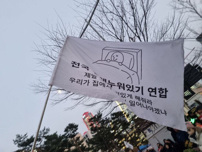 ‘전국 집에 누워있기 연합’ 깃발을 들고 발언대에 오른 지승호(24)씨 말에 집회 참가자들이 터트린 웃음은 뒤이은 지씨 말에 잦아들었다. “집에 누워만 있고 싶은 저도 일어나서 탄핵을 외치고 있고, 여성, 청소년, 성소수자, 장애인, 노약자 등 다양한 사회적 약자가 나와 한 목소리로 탄핵을 외치고 있습니다. 그런데 국민의힘은 지금 무얼 하고 있습니까.” 이어 지씨가 말했다. “오늘 대국민 담화를 본 분들은 아시겠지만 더는 탄핵을 미뤄선 안 됩니다. 내일 당장에라도 끌어내려야 합니다.”