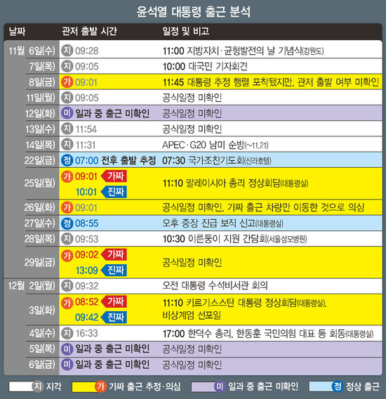 한겨레가 11월6일부터 12월6일까지 주말과 대통령 국외 순방을 제외한 18일 동안 윤 대통령의 출근을 확인한 결과, 오전 9시 이전 출근은 두차례밖에 되지 않았다. 이 기간 가짜 출근으로 추정되는 차량마저 아침 9시가 넘어 뒤늦게 출발하는 사례가 목격되기도 했다. 윤 대통령이 언제 관저를 나설지 경찰들도 정확히 모르기 때문이다. 윤 대통령의 출근 시각을 알 수 없어 관저에 있는 차량이 오전 9시까지 기다리다가 윤 대통령이 나오지 않으면 가짜 출근 차량마저 지각 출발을 하는 것으로 추정된다.