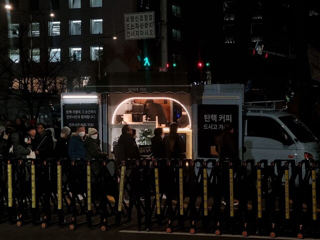 집회에 나온 시민들은 곳곳에서 핫팩, 응원봉 등 물품을 나누며 서로 힘을 북돋웠다. 한 시민은 사비를 털어 ‘탄핵 커피차’를 운영하며 집회에 참가자들에게 무료로 커피를 제공했다. 전국공무원노동조합도 백설기 1000인분을 준비해 집회 참가자들에게 나눠줬다. 전공노 관계자는 “모두가 함께 민주주의를 바로잡기 위해 애쓰는데 조금이라도 보탬이 되고 싶다는 마음으로 떡을 준비했다”고 말했다. < 한겨레 정인선 고나린 기자 >