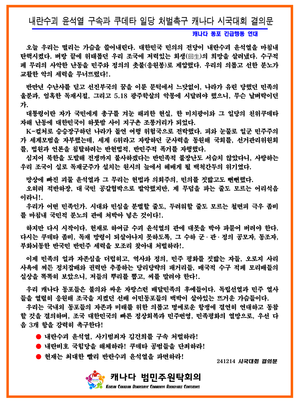 캐나다 범민주원탁회의를 비롯해 한국 민주주의를 위한 온타리오 학생-연구자 긴급행동, 토론토 생태희망연대, 토론토 한신동문회, 김대중재단 토론토지회 등 9개 단체가 공동 연대로 개최한 집회 참가 동포들은 결의문을 채택해 “수구 적폐무리의 사악한 난동을 민주와 정의의 응원봉으로 제압했다”고 윤석열 탄핵을 반기며 “민족의 얼과 자존심을 더럽히고 역사와 정의, 민주평화를 짓밟는 자들의 실상을 똑똑히 보았다. 뿌리를 뽑아야 한다”며 윤석열 김건희 구속처벌과 국힘당 해체, 헌재의 신속한 윤석열 파면 등을 촉구했다.