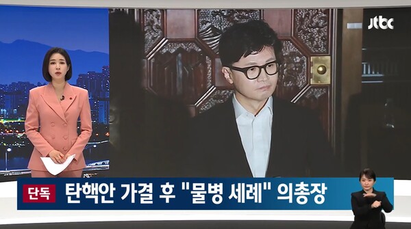 한민용 JTBC 앵커는 지난 19일 ‘뉴스룸’ <단독 탄핵안 가결후 “물병세례” 의총장> 앵커멘트에서 “불법계엄으로 긴박했던 그 밤에는 조용하던 의원들이 탄핵안이 가결되고 열린 비공개 의원 총회에서는 목소리를 높였다”며 “한동훈 당시 대표를 향해 사퇴하라 소리를 치고 물병까지 던졌는데 당시 의총장 상황이 담긴 녹취를 확보했다”고 밝혔다. JTBC는 리포트에서 “이때, 한 대표에게 물병을 던진 사람도 있었다고 한다”고 전했다. 이어 F의원은 한 대표를 향해 “도라이 아냐 도라이?”라고 말했고, G의원은 “저런 놈을 갖다가 법무부 장관을 시킨 윤석열은 제 눈 지가 찌른 거야”라고 말하는 녹취 육성도 방송했다.