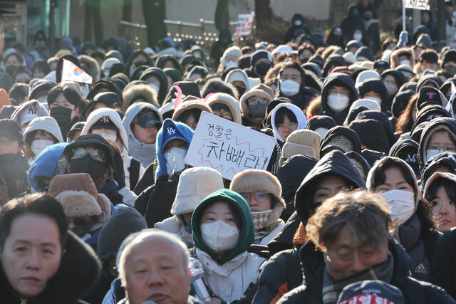 시민들은 트랙터를 막고 있는 ‘경찰 차벽’이 부당하다고 입을 모았다. 집회 현장에서 책을 펴고 공부하던 신미영(23)씨는 “노무사 시험을 준비하고 있는데 이 자리에 함께하지 않으면 스스로 떳떳하지 않을 것 같아 나왔다”며 “트랙터를 막고 있는 경찰들은 집에 돌아가도 떳떳하게 쉴 수 없겠지만 여기 시민들은 떳떳하게 쉴 수 있을 거라 생각한다. 농민들이 위험한 행위를 한 것도 아닌데 무조건 제재하는 건 민주사회에서 있을 수 없는 일”이라고 비판했다. 구로에서 온 정윤현(22)씨도 “집회는 신고제이지 허가제가 아닐뿐더러, 서울 입구에서 트랙터가 막혔다는 건 여전히 정부기관이 윤 대통령을 엄호하고 있다는 걸 보여준다”며 “윤 대통령은 소환조차 못 하면서 시민들의 기본 권리는 왜 막느냐”고 꼬집었다.