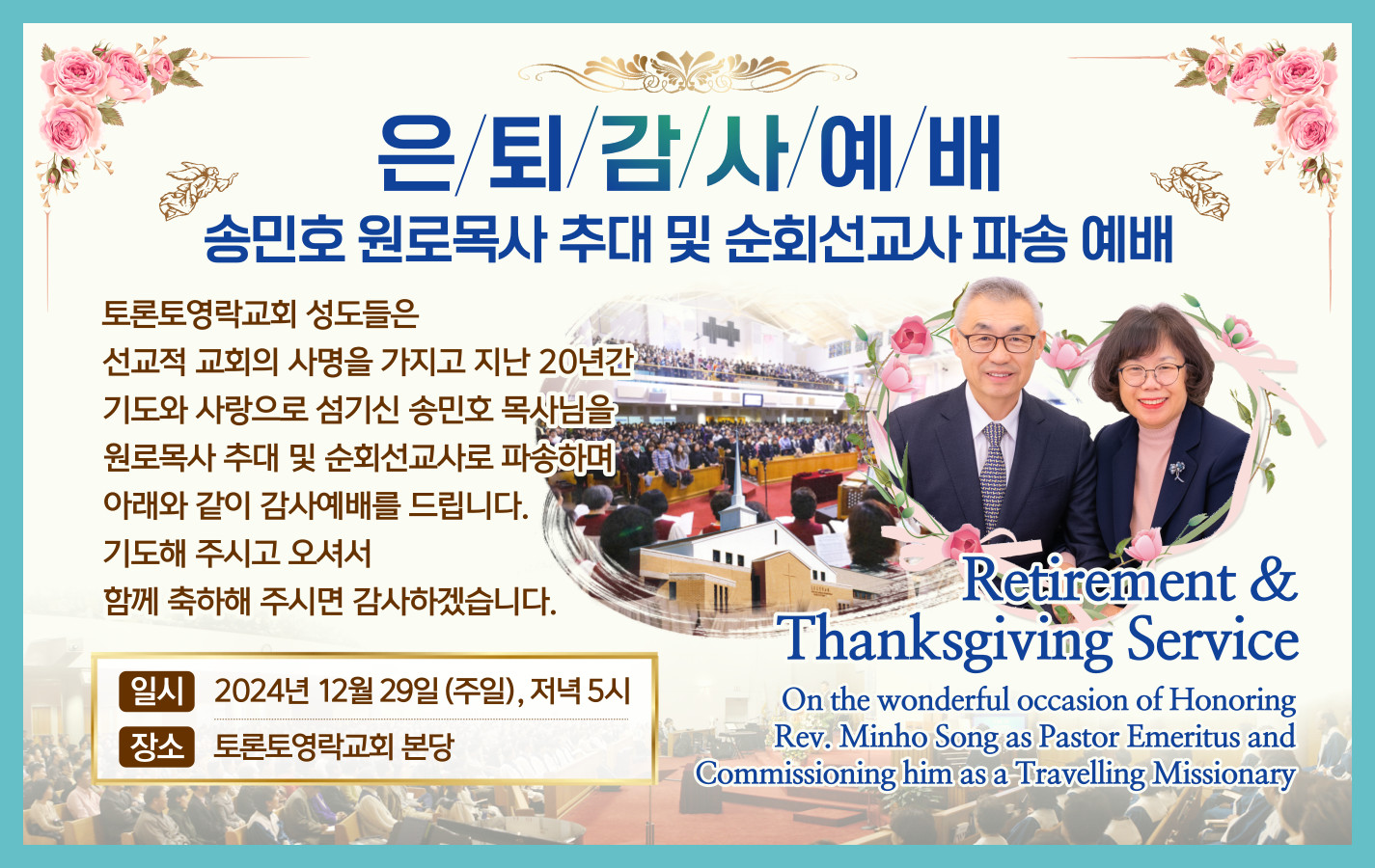 토론토 영락교회는 올해 말 현직 목회를 떠나는 송민호 담임목사 은퇴 감사예배를 오는 12월29일 주일 오후 5시 교회 본당에서 드린다. 이날 예배는 은퇴하는 송민호 목사의 원로목사 추대와 순회선교사 파송예배를 겸해 드린다.