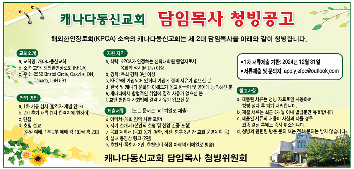 해외한인장로회(KPCA) 동노회 캐나다동신교회(담임 박태겸 목사: 2552 Bristol Cir. Oakville, ON L6H 5S1)가 진행중인 제2대 담임목사 청빙응모 접수가 이달말(12월31일)까지 진행된다.