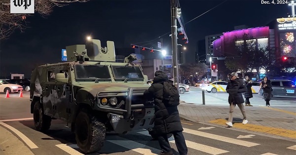해당 영상은 지난 4일 워싱턴포스트(WP)가 촬영한 것으로 윤석열 대통령이 비상계엄을 발동한 당일 여의도 국회의사당 근처로 진입하는 군용차를 막는 모습이 담겼다. 한 청년이 맨 손으로 군용차량을 막자 시민들이 합세하며 차량을 이동을 멈췄다.