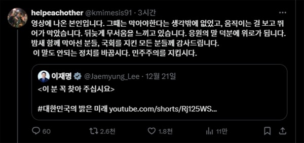12·3 비상계엄 사태 당시 국회로 출동했던 군용차량을 맨몸으로 막아 '맨몸 의인'으로 화제가 된 남성이 '꼭 찾아달라'는 더불어민주당 이재명 대표에 응답했다.
