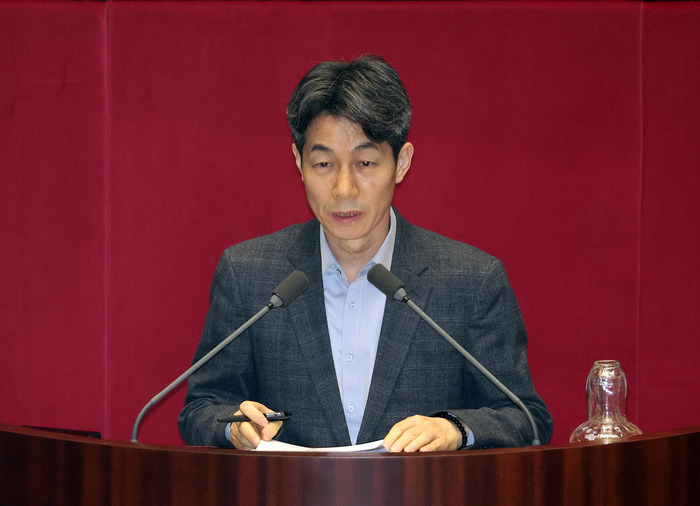 윤건영 더불어민주당 의원이 지난 11일 오후 국회 본회의에서 ‘윤석열 대통령 위헌적 비상계엄 선포 내란행위’와 관련해 질문하고 있다. 연합