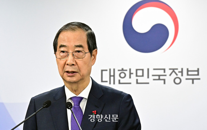 한덕수 대통령권한대행이 26일 서울 종로구 정부서울청사 합동브리핑실에서 대국민담화를 하고 있다.