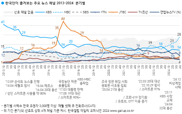 갤럽이 조사를 시작한 2013년부터 2024년까지 12년간 뉴스 채널 선호도 추이에서 가장 큰 변화를 보인 방송사는 KBS, JTBC, 그리고 MBC다. KBS는 2013년 1분기 당시 한국인 41%가 가장 즐겨보는 뉴스 채널이었으나, 세월호 참사가 발생한 2014년 2분기 처음으로 20%대, 국정농단 파문이 거셌던 2017년 초 10%대로 하락했다. 2023년 들어서는 정부의 시청료 분리 징수 시행, 신임 사장 임명, 일부 프로그램 전격 개편·폐지 등 격랑을 겪었다. 2024년 1분기 선호도 최저치(13%)를 기록했다.