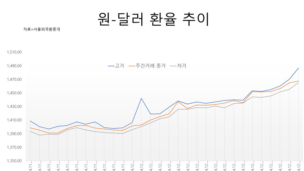 서울 외환시장에서 원-달러 환율이 27일 장중 한때 1486.7원까지 올랐다. 전날 종가(1464.8원)에 견줘 21.9원(1.5%) 상승하고, 3일 밤 내란사태 전 주간거래 종가(1402.9원)에 견줘서는 83.8원(5.97%)이나 오른 것(원화가치는 하락)이다. 다만 이날 주간거래는 상승폭을 대거 반납한 1467.5원에 거래를 마쳤다.