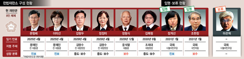 최 권한대행이 재판관으로 임명한 정계선 서울서부지법원장(더불어민주당 추천)과 조한창 변호사(국민의힘 추천)는 각각 진보와 보수로 분류된다. 두 사람의 합류로 헌재 구도는 진보 2명, 중도·보수 3명, 보수 1명 구도에서 진보 3명(문형배 헌재 소장 권한대행, 이미선·정계선 재판관), 중도·보수 3명(김형두·정정미·김복형 재판관), 보수 2명(정형식·조한창 재판관)으로 재편됐다.