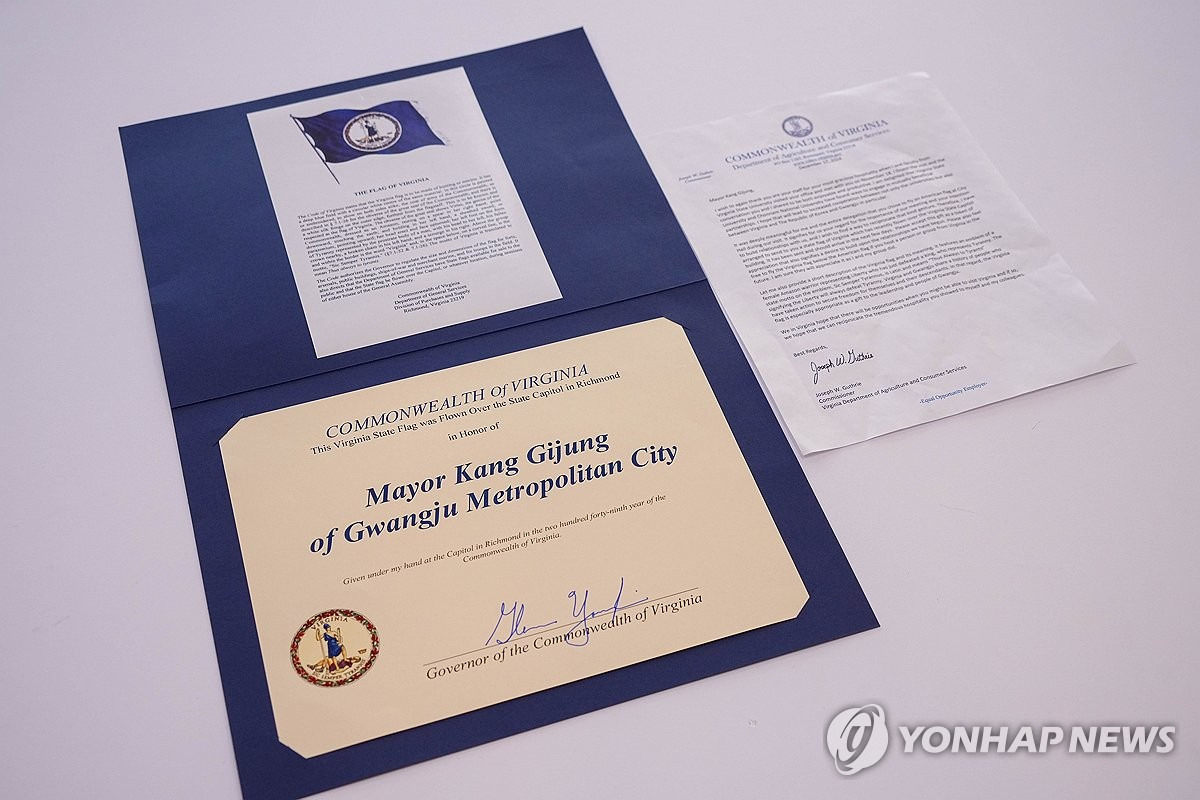 광주시는 이날 오전 청사 게양대에 미국 버지니아주 주지사가 보낸 주(州) 깃발을 내걸었다.