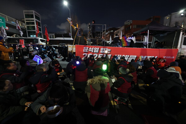 윤석열 대통령에 대한 공수처의 체포영장 집행이 불발된 3일 오후 서울 용산구 대통령 관저 인근에서 민주노총 조합원들이 체포·탄핵 찬성 집회를 하고 있다. 민주노총은 내일 밤까지 철야 농성을 이어간다. 2025.1.3. 연합