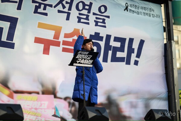그는 "윤석열은 지금 제2의 내란을 하고 있다"며 "공수처는 내란 세력의 기를 살려주러 간 것이냐. 정신 똑바로 차려라"고 말했다. 시민들은 "윤석열은 광장으로 나와라" "윤석열을 체포하라" "윤석열을 파면하라"고 구호를 외쳤다.