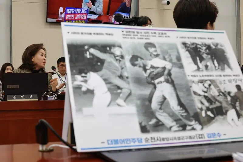김문수 민주당 의원은 이한열 열사가 1987년 시위 도중 경찰이 쏜 최루탄에 맞은 사진과 백골단이 시위 참가자에게 폭력을 행하는 사진 등을 보이며 “고등학교 교과서 대부분에 실린 사진이다. 이한열 열사의 희생 뒤엔 최루탄만 있던 게 아니라 민주주의를 짓밟았던 폭력 조직 백골단이 있었다”고 했다. 이어 “백골단이라는 이름이 교육위원인 김민전 의원의 기자회견장에 소환됐다”며 “교육위는 김 의원님 같은 분이 계실 자리는 아니다. 지금 당장 사퇴하길 바란다”고 했다.