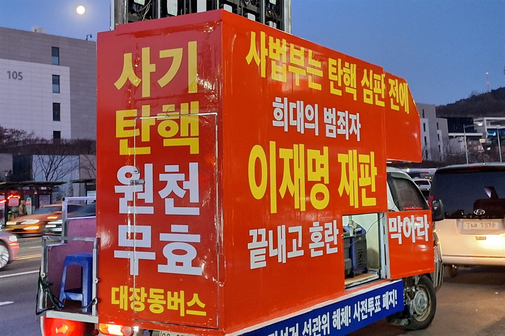 ▲윤석열 대통령이 체포된 15일 서울 한남동 대통령 관저 앞 우파 집회에 이재명 더불어민주당 대표를 비난하는 트럭이 등장했다.조성식