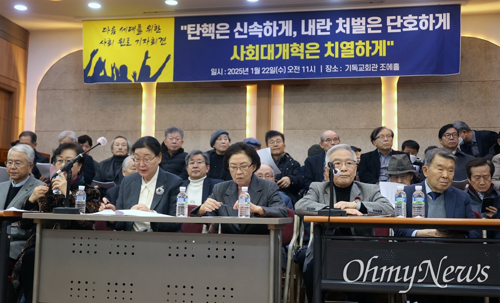 ▲교육·학계·노동·군·농민·문화·예술·체육·법조·보건·의료·시민사회·언론·종교 등 원로들이 22일 오전 서울 종로구 한국기독교회관에서 기자회견을 열어 12.3 윤석열 내란사태에 대해 “12월 3일의 계엄은 윤석열 대통령의 삐뚤어진 망상의 결과인 동시에 낡은 시스템의 부작용이 극단적으로 표출된 결과이다”며 “역사적 퇴행을 다시 반복하지 않으려면 대통령의 파면과 교체를 넘어서 새로운 시스템을 만들어야 한다”고 호소했다. ⓒ 유성호